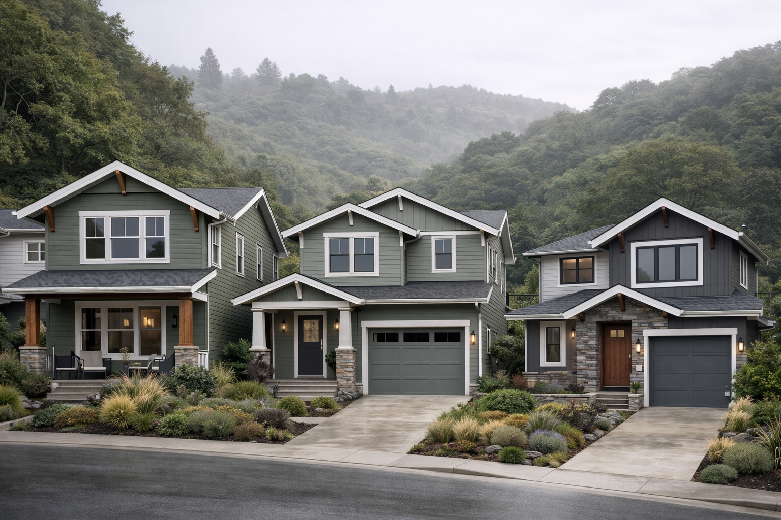This color group is an excellent fit for Craftsman, hillside homes, Modern Farmhouse designs, and custom builds, featuring James Hardie® colors such as Mountain Sage, Aged Pewter, and Night Gray, which carries a subtle green-gray undertone. These shades work especially well in the local environment by complementing surrounding hills, trees, and natural landscaping while delivering an upscale, regionally appropriate look.